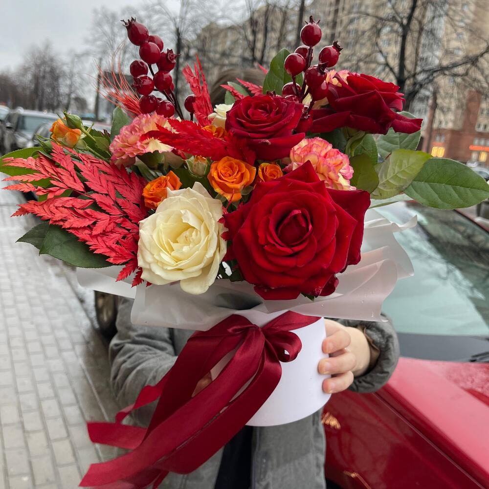 Гвоздика сортовая – 3 шт.Роза Россия 50 см – 9 шт.Ягоды декоративные – 2 шт.Оазис флористический – 1 шт.Салал пучок – 1 шт.Кустовая роза оранжевая 50 см – 2 шт.папоротник ветка – 2 шт.коробка маленькая – 1 шт.колосок полевой – 1 шт.
