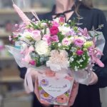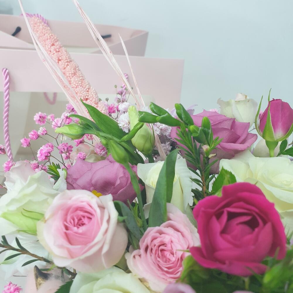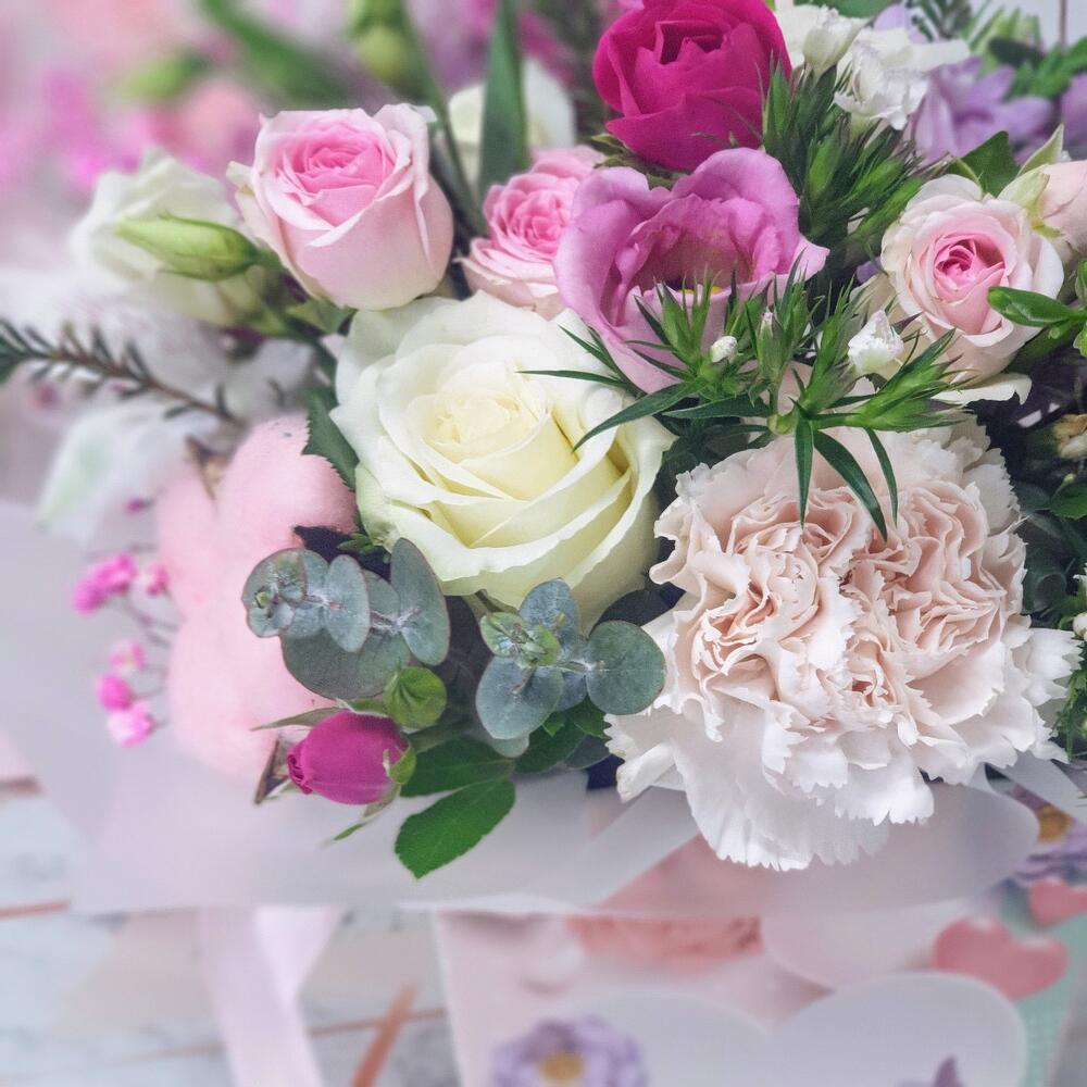 Эвкалипт – 1 шт.Роза кустовая пионовидная – 2 шт.Гвоздика турецкая – 1 шт.Лизиантус розовый – 1 шт.Открыточка с вашими пожеланиями – 1 шт.Роза белая 50 см – 3 шт.Хамелациум белый – 1 шт.Альстромерия белая или розовая – 1 шт.хлопок розовый – 1 шт.роза кустовая фуксия – 1 шт.гипсофила пучок – 1 шт.любовь флориста (бесплатно) – 1 шт.пакет подарочный с окном – 1 шт.коробка с ручками с оазисом и лентами – 1 шт.гвоздика диантус кремовая – 1 шт.лилия азиатка бутон – 1 шт.