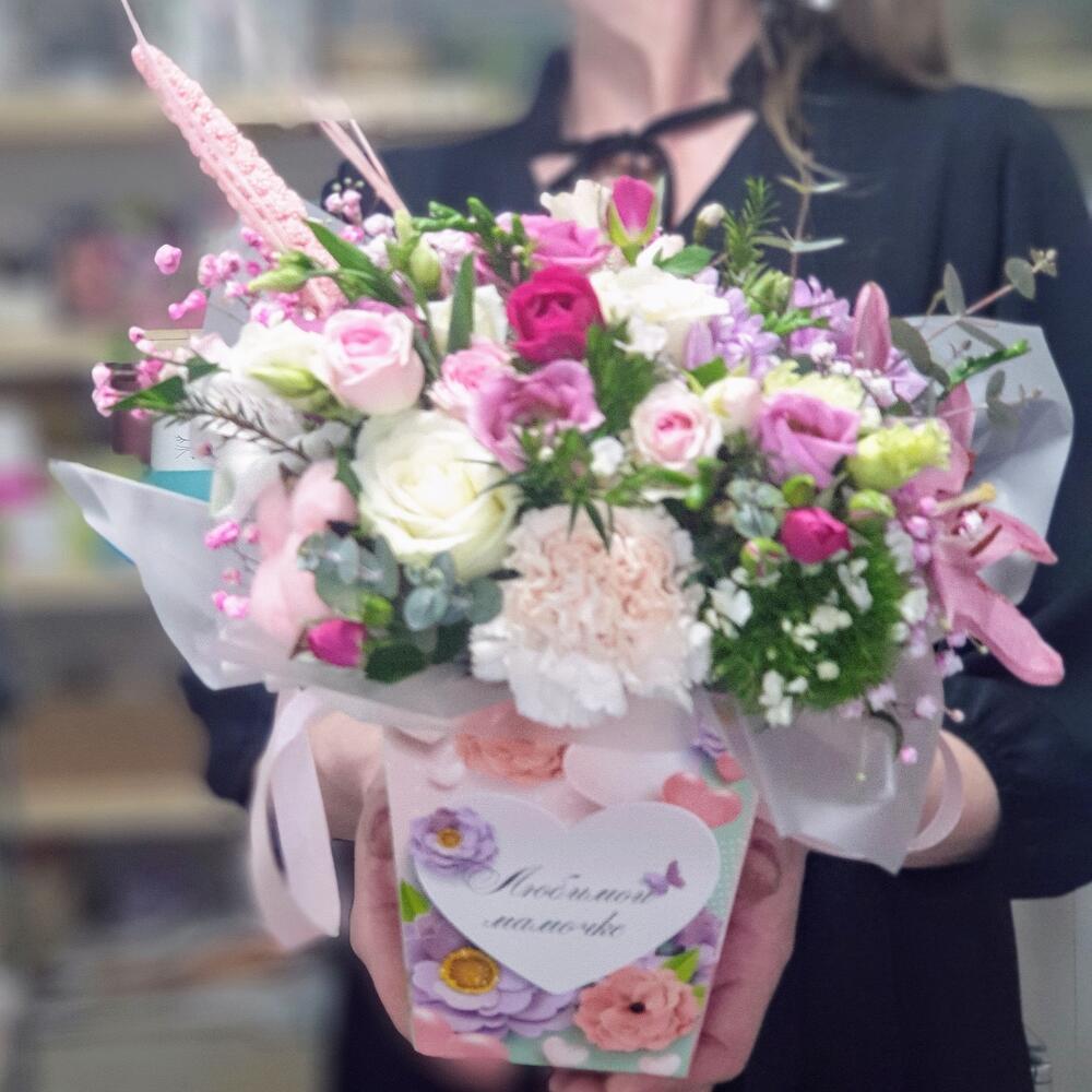 Коробочка с различными цветами в коробочке с текстом “Любимой маме”. В подарочном пакете с ручками. Дарите с удовольствием)))