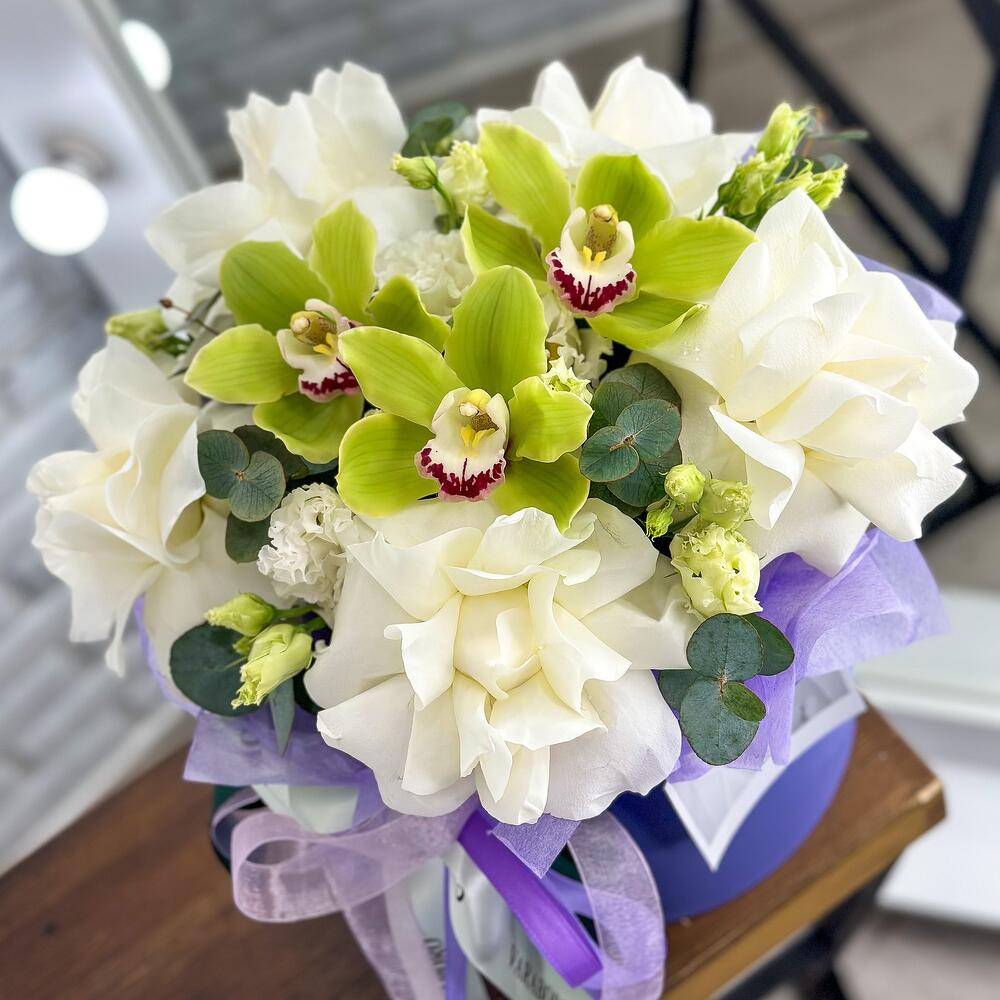 Воздушная,такая кружевная композиция в шляпной коробке с белоснежными французскими розами,долгоиграющими орхидеями,махровым лизиантусом и эвкалиптом порадует Вас стойкостью,можете в этом не сомневаться)Цветы стоят в специальной флористической губке ,что позволяет им больше оставаться свежими и радовать получателя.Так же композиция в коробке это очень удобно и эффектно!Добавляйте товар и магазин в избранное,чтобы было легче нас найти с Уважением VaraBoro flowers