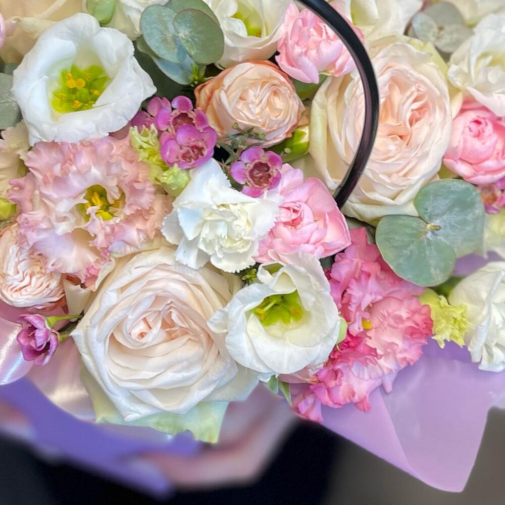 Ваксфлауэр – 2 шт.Лизиантус – 10 шт.Упаковка – 3 шт.Лента атласная – 2 шт.Сумочка – 1 шт.Диантус кустовой – 10 шт.Оазис флористический – 1 шт.Эвкалипт Baby Blue – 10 шт.Роза пионовидная охара – 3 шт.бомбастик роза пионовидная – 2 шт.