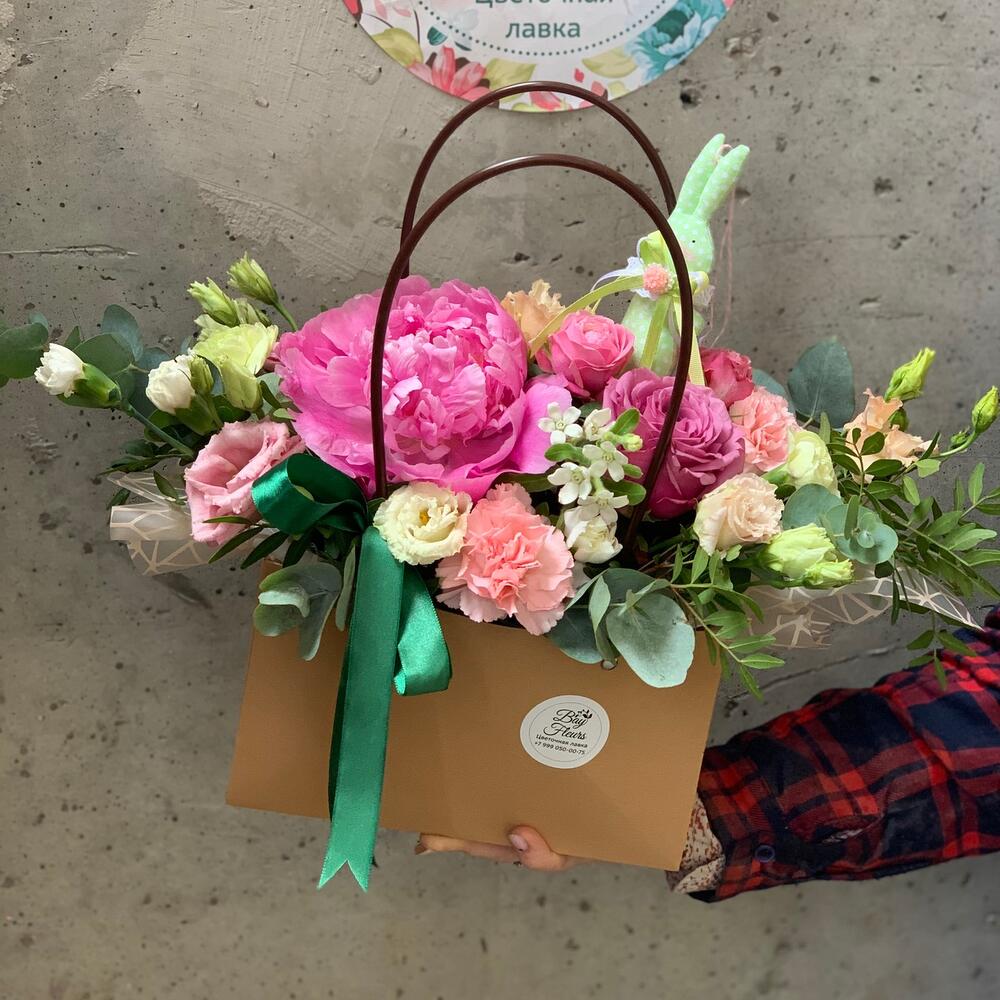 Удобная композиция в крафтовом пакете с игрушкой ручной работы будет замечательным подарком каждому получателю!!! P.S. В не сезон Пионов,будет замена на Пионовидные розы.