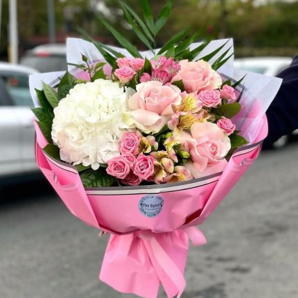 Роскошный букет с гортензиями и пионовидными розами