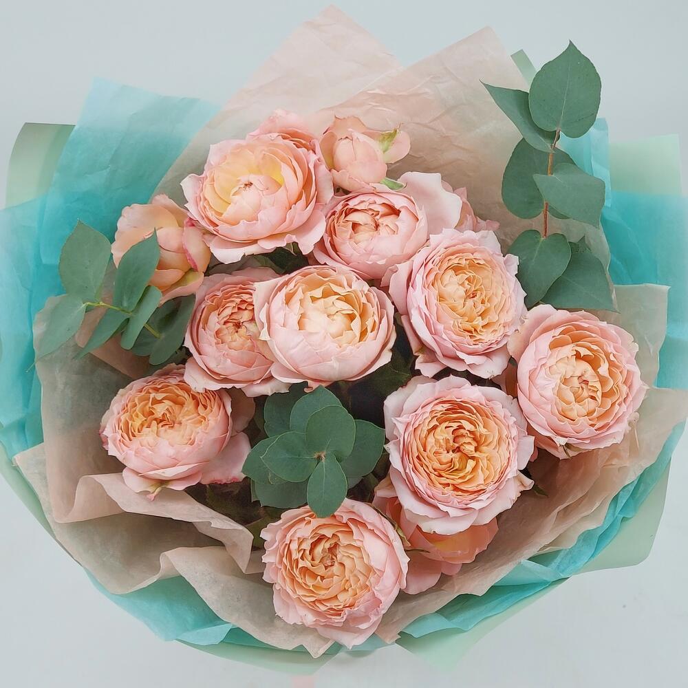 Эвкалипт – 3 шт.Упаковка дизайнерская – 1 шт.Роза кустовая пионовидная джульетта – 5 шт.