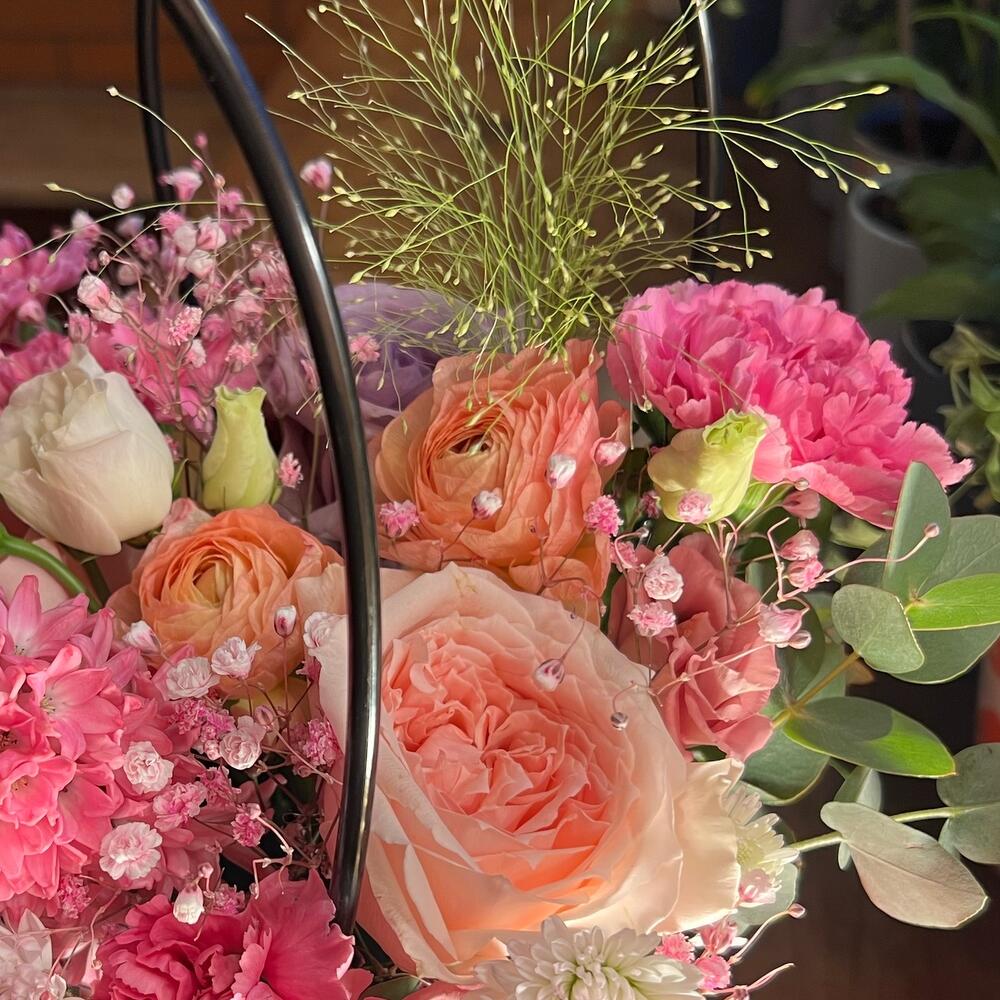 Альстромерия – 2 шт.Гиацинт – 1 шт.Гипсофила – 1 шт.Паникум – 1 шт.Хризантема кустовая – 1 шт.Роза одноголовая – 2 шт.Эустома – 2 шт.Диантус – 4 шт.Пионовидная роза одноголовая – 1 шт.ранункулюсы – 2 шт.зелень эвкалипта – 1 шт.