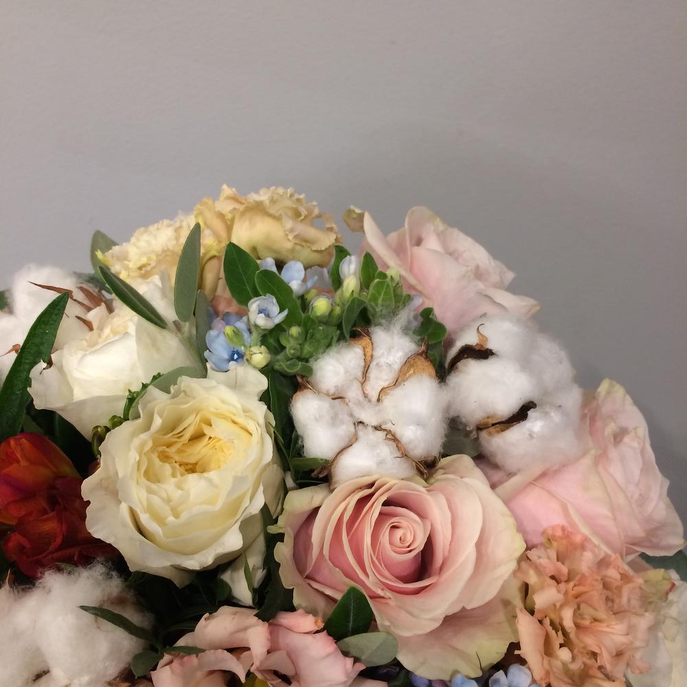 Тёплый, нежный букет с хлопком, розами, твидией и эвкалиптом.Стильное цветочное решение для любого случая.⠀Ширина букета около 50 сантиметров, высота букета около 60 сантиметров.
