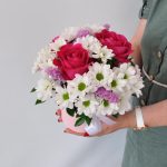 Хризантема кустовая – 3 шт.Лента атласная – 1 шт.Коробка шляпная – 1 шт.Фисташка – 2 шт.Роза Pink Floyd – 3 шт.Статица розовая – 1 шт.Оазис флористический – 1 шт.