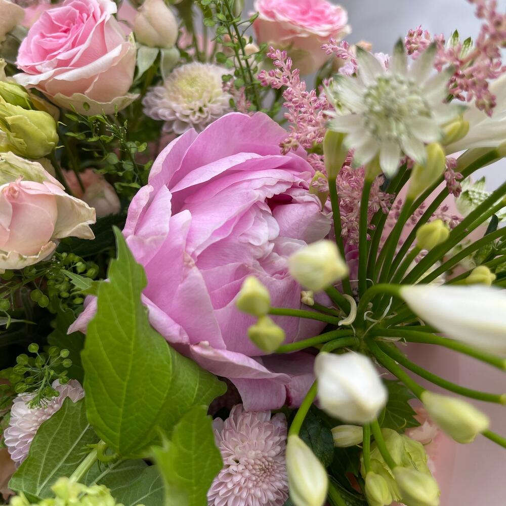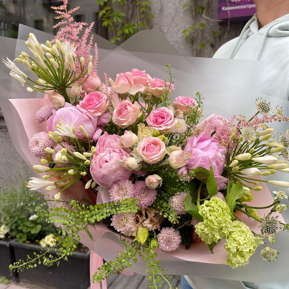 Пион Сара Бернар розовый – 3 шт.Вибурнум – 1 шт.Агапантус – 3 шт.Астранция – 2 шт.Гринбелл – 1 шт.Астильба – 2 шт.Сантини – 3 шт.Роза кустовая – 2 шт.Упаковка дизайнерская – 1 шт.Лента атласная – 2 шт.