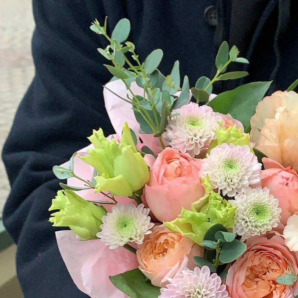 Композиция из пионовидных роз, кустовых хризантем и эвкалипта