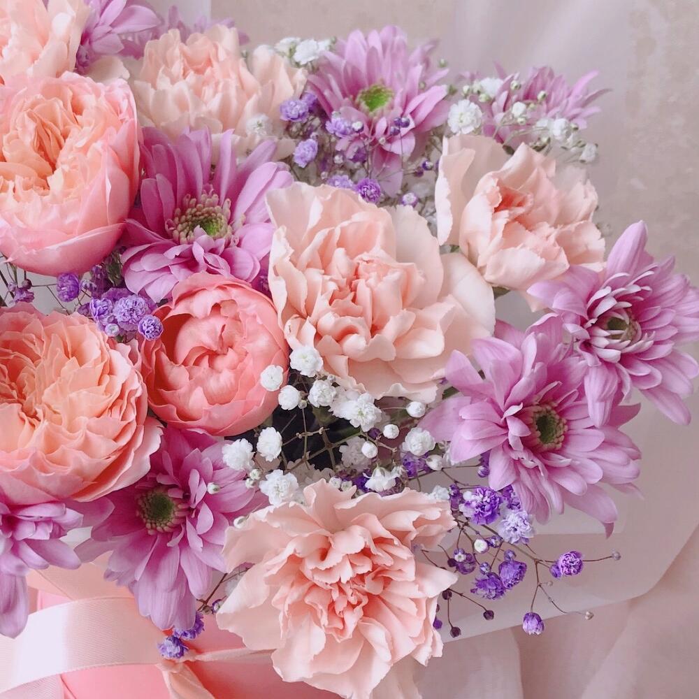 Гипсофила – 2 шт.Хризантема кустовая – 2 шт.Диантус – 5 шт.Шляпная коробка с лентой – 1 шт.Флористическая губка – 1 шт.Пионовидная роза джульетта – 1 шт.инструкция по уходу за цветами – 1 шт.