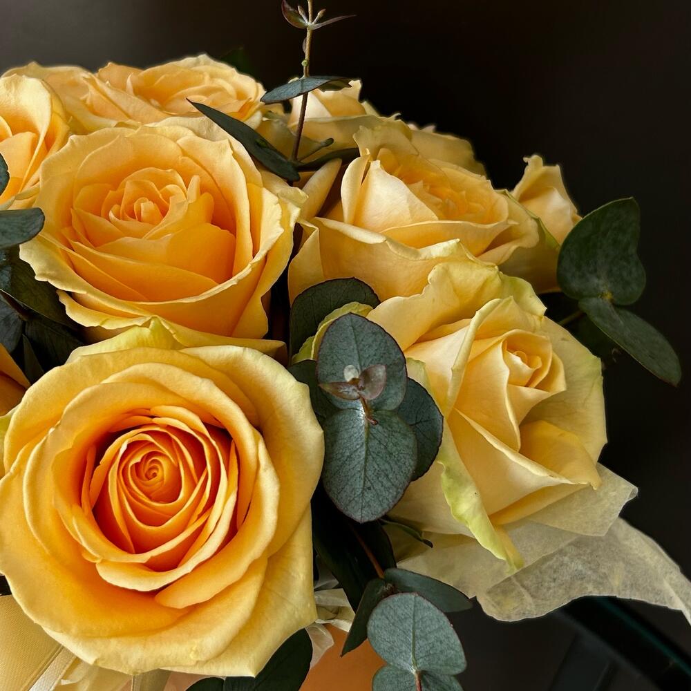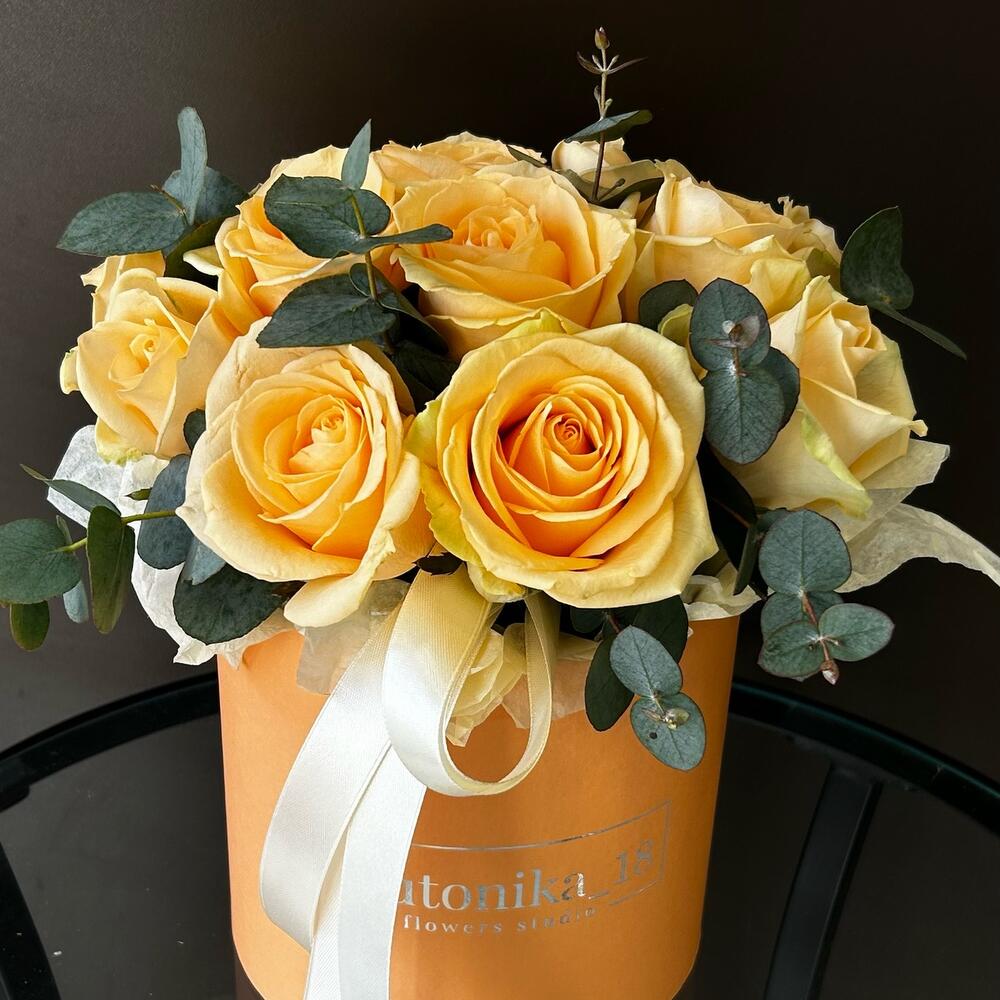 Композиция в коробке из 15 персиковых роз и ароматного эвкалипта