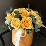 Пиафлор (оазис) – 1 шт.Эвкалипт – 2 шт.Роза – 15 шт.Лента атласная – 2 шт.Коробка шляпная – 1 шт.Упаковка дизайнерская – 2 шт.