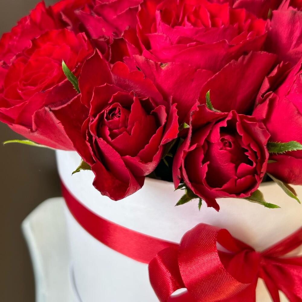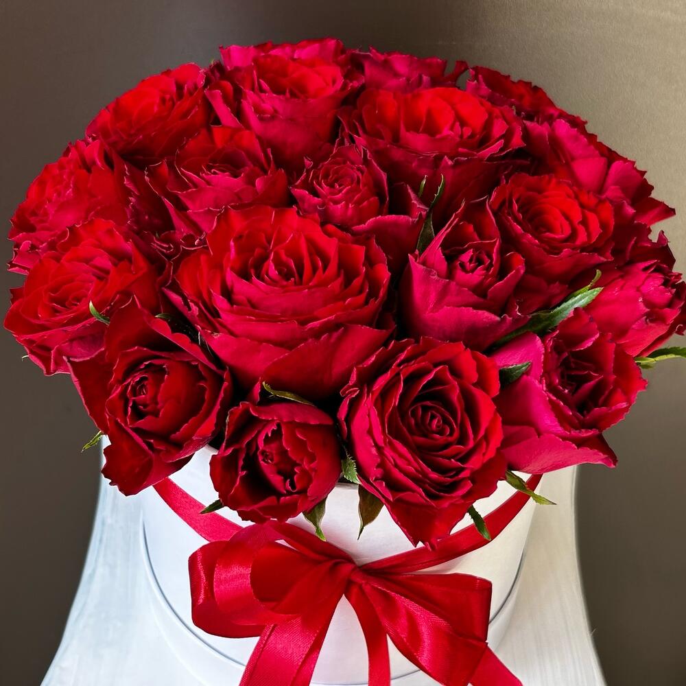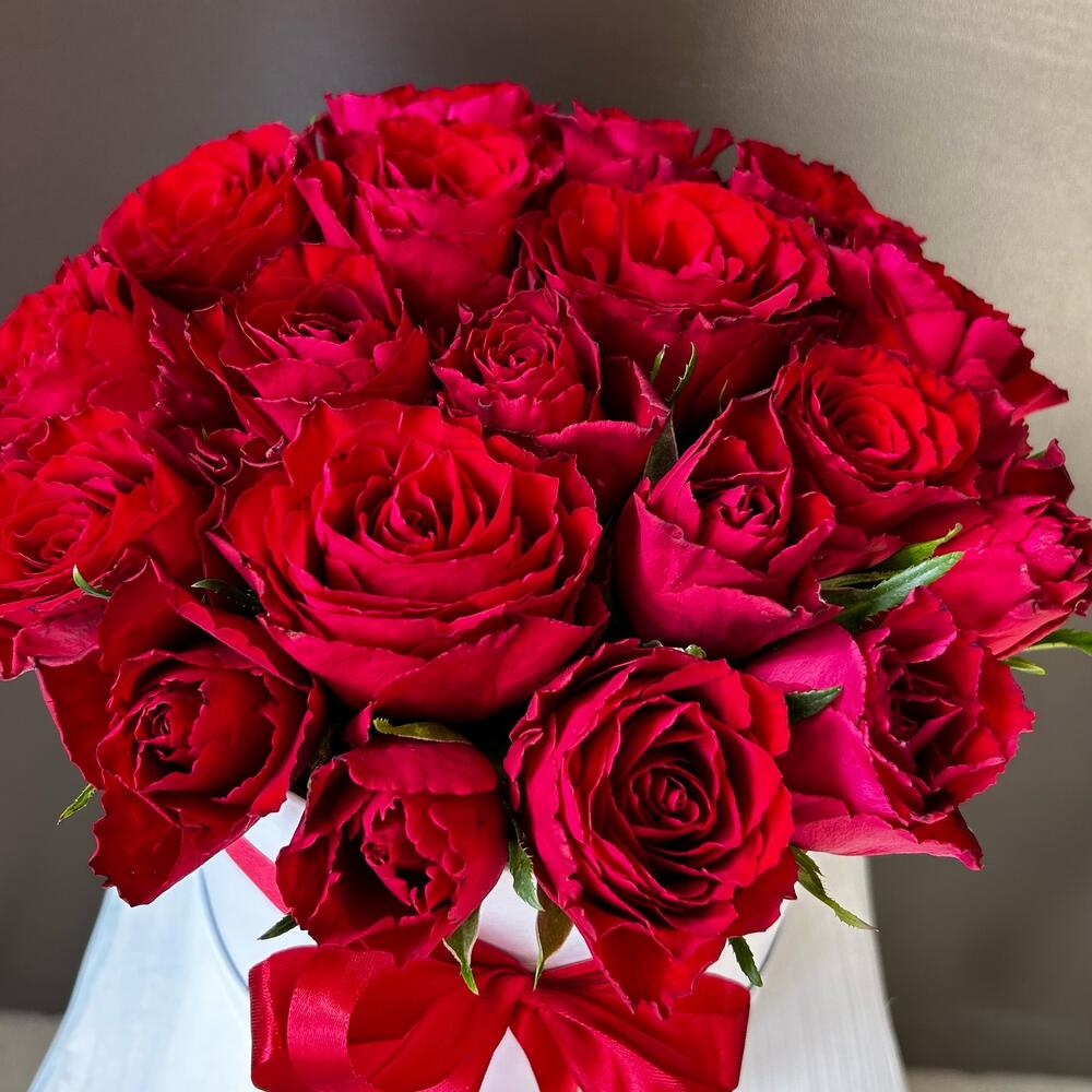 Пиафлор (оазис) – 1 шт.Роза – 19 шт.Лента атласная – 2 шт.Коробка шляпная – 1 шт.Упаковка дизайнерская – 2 шт.