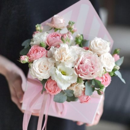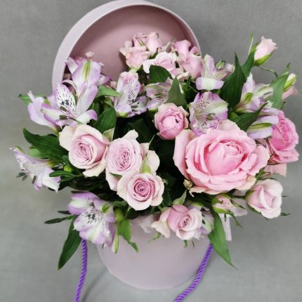 Нежная и воздушная композиция из французских роз, эустомы и диантуса в шляпной коробке