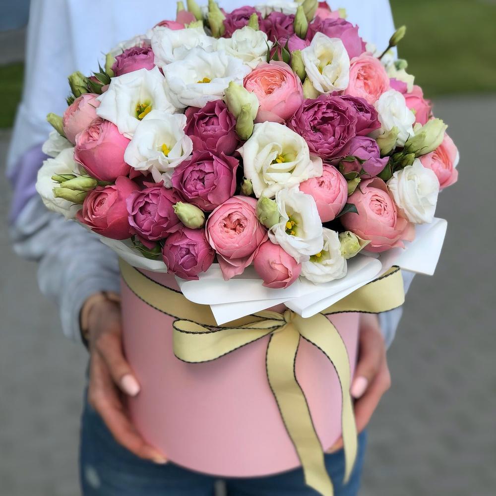 Эустома – 5 шт. Кустовая пионовидная роза – 15 шт. Писташ – 2 шт. Коробка – 1 шт. Оазис – 4 шт.