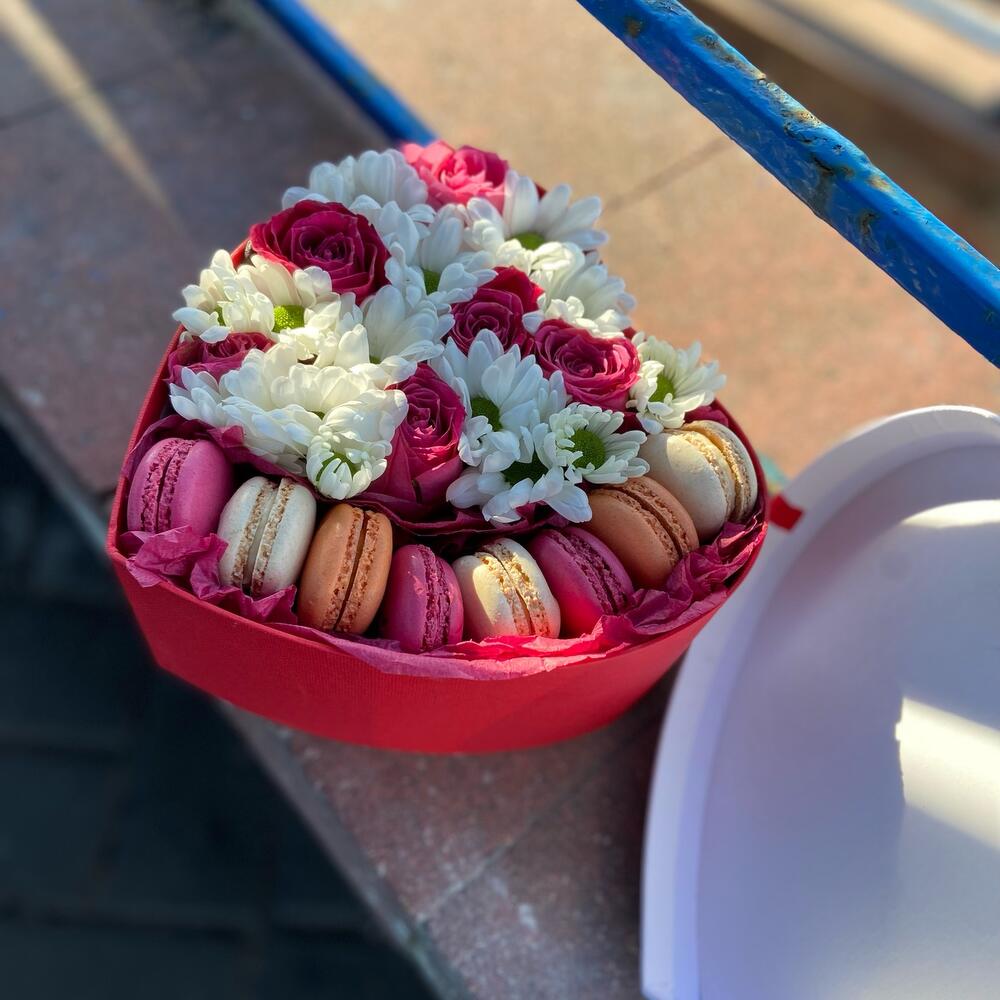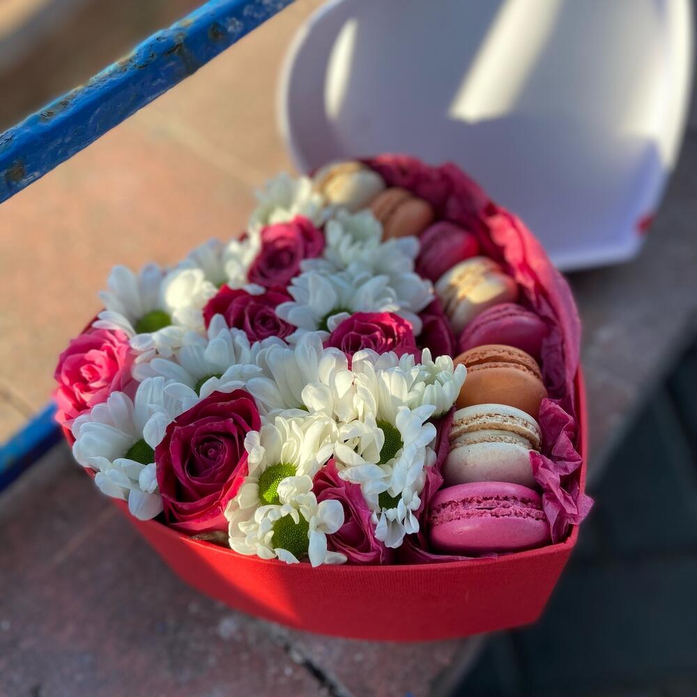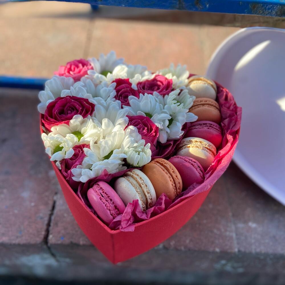 “Сладкое сердце ” – цветочная композиция с сладостями в коробке “Сердце”