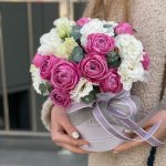 Коробка Валенсия с кустовыми пионовидными розами и эустомой