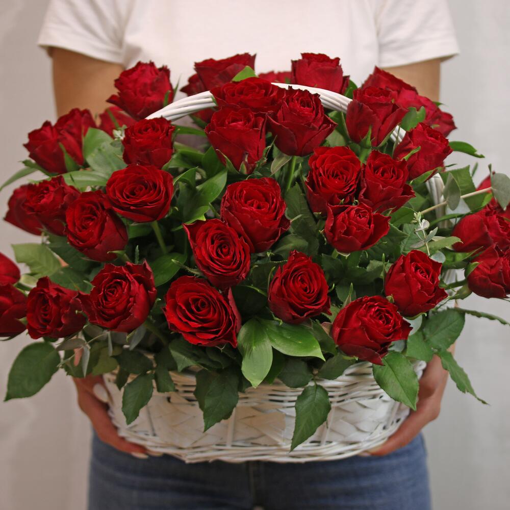 Метки: 51 роза, от 5000 руб, цветы в корзине
