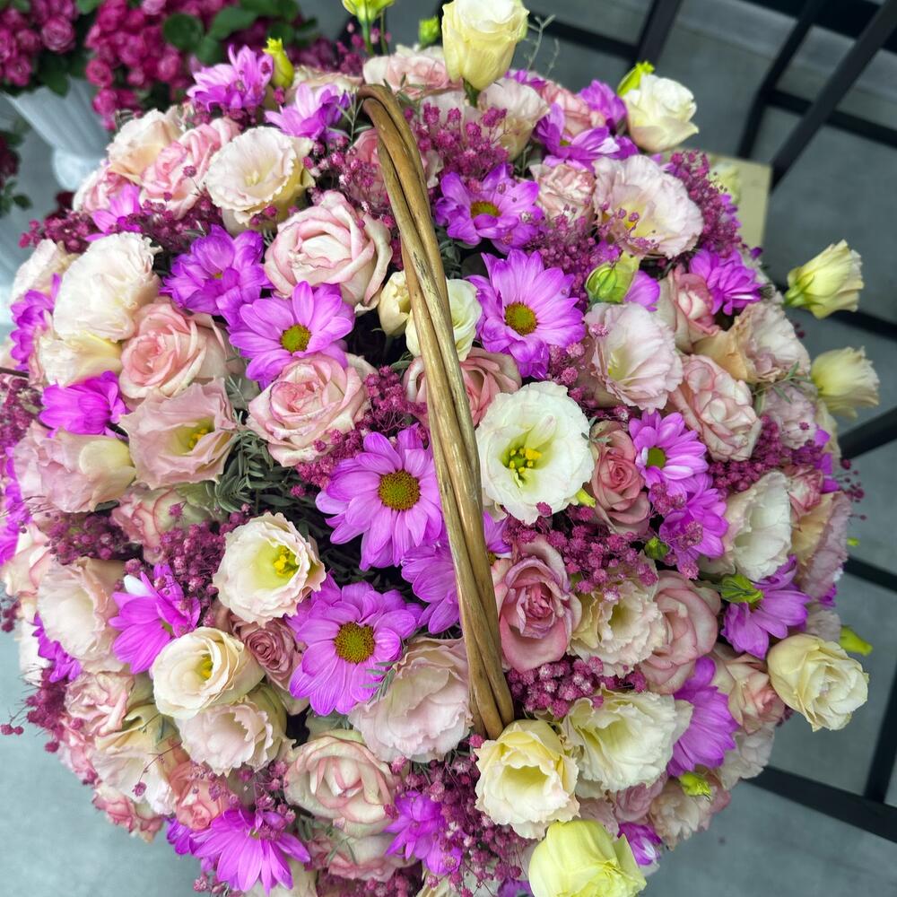 Роза – 29 шт. Хризантема – 33 шт. эустомы – 11 шт. зелень декоративная – 5 шт. Корзина плетеная – 1 шт.