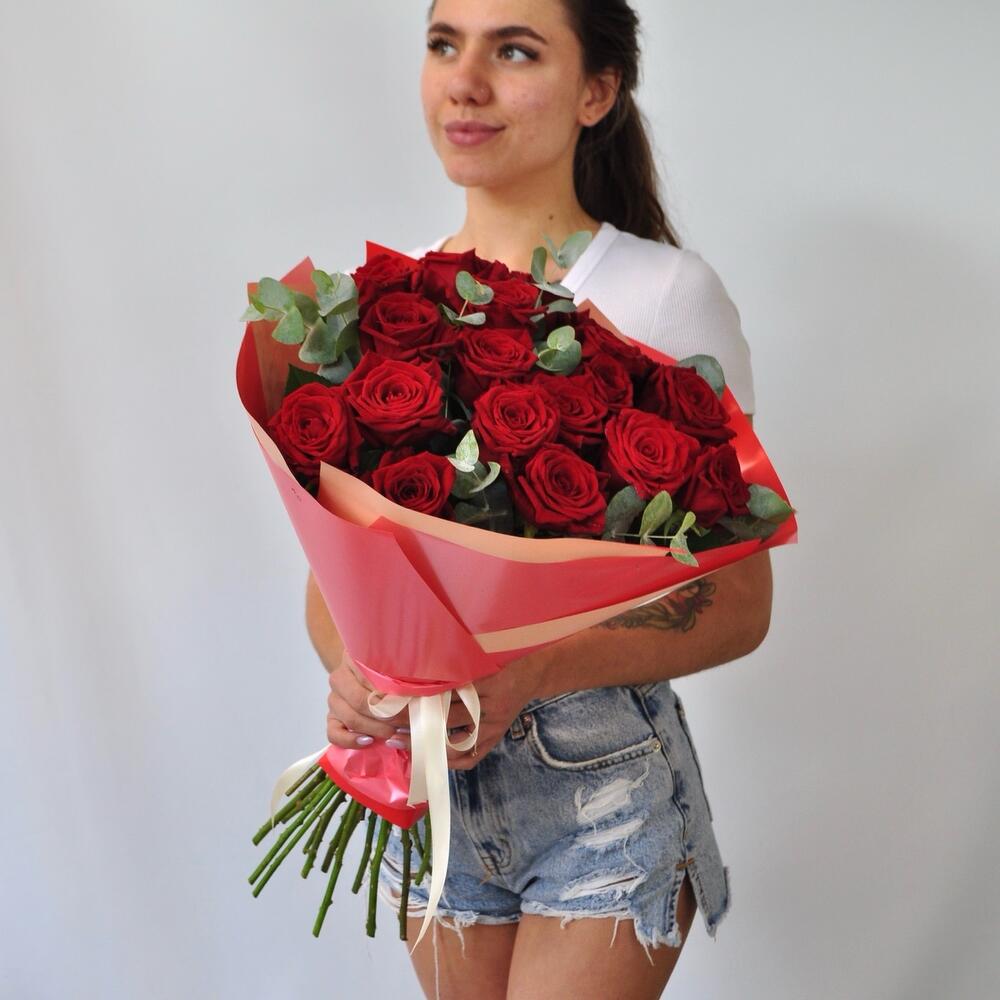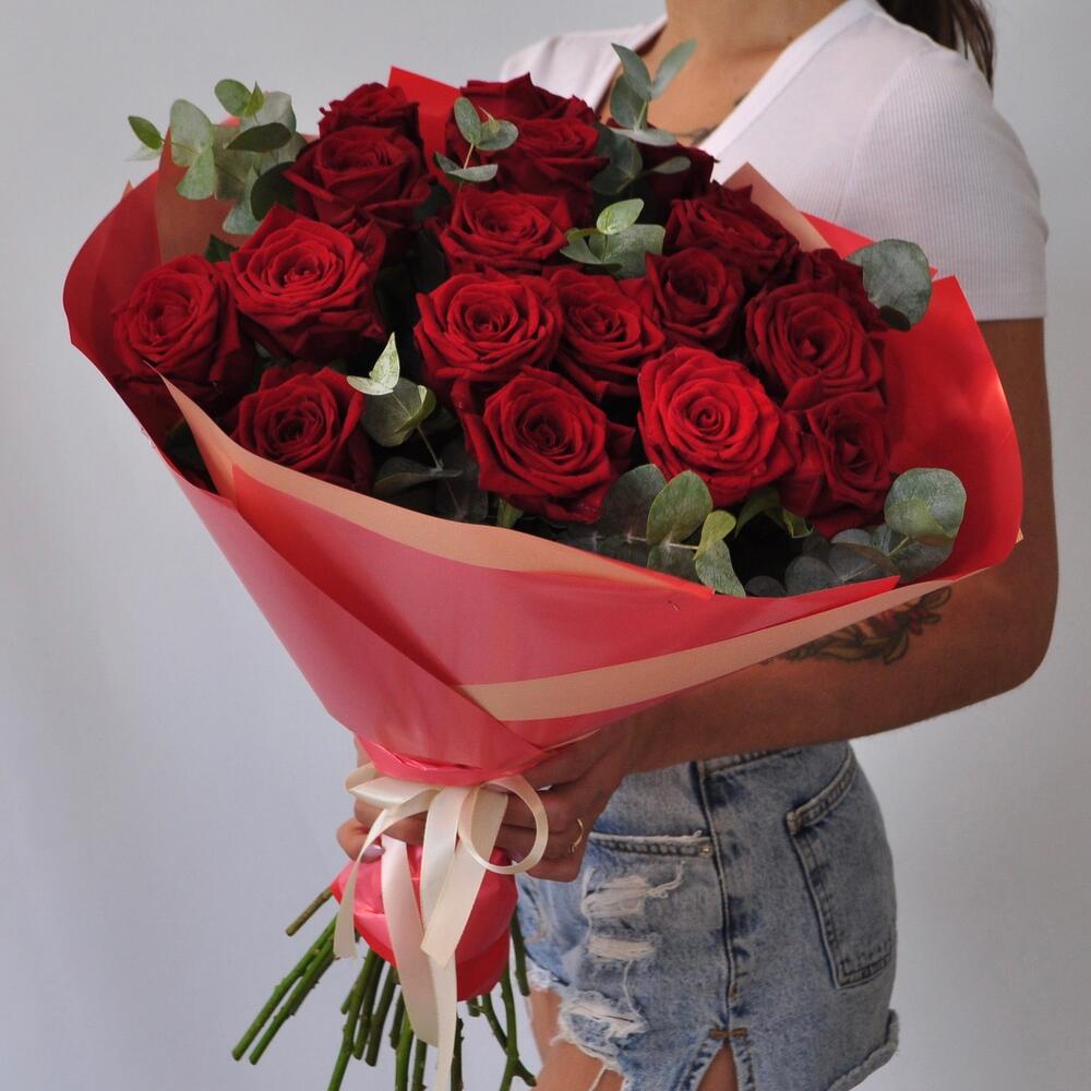 Эвкалипт – 5 шт.Лента атласная – 1 шт.Упаковка дизайнерская – 2 шт.Роза Россия 60 см – 19 шт.