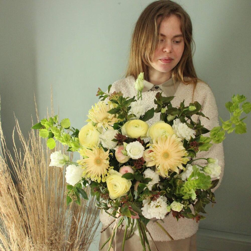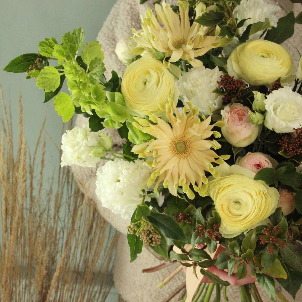 Ранункулюс – 5 шт.Гербера – 3 шт.ирландский колокольчик – 3 шт.Лизиантус – 4 шт.Роза кустовая пионовидная – 2 шт.Вибурнум – 3 шт.Лента атласная – 1 шт.