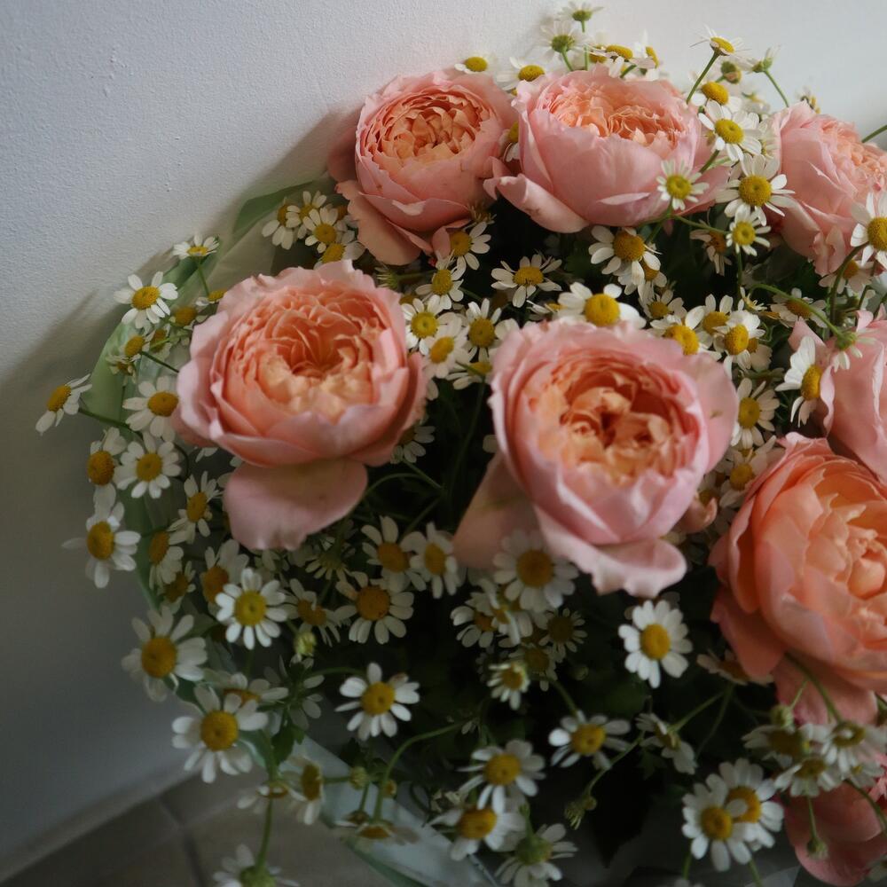 роза кустовая джульетта пионовидная – 3 шт.Матрикария (Ромашка Камила) – 5 шт.тишью водостойкое – 5 шт.пленка глянцевая – 4 шт.Рафия – 1 шт.