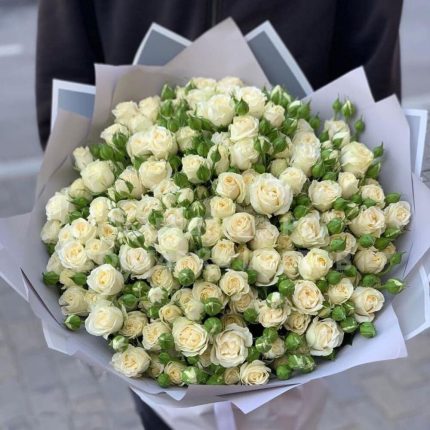 Пионовидная кустовая роза – 101 шт. Упаковка дизайнерская – 3 шт. Открыточка с вашими пожеланиями – 1 шт.