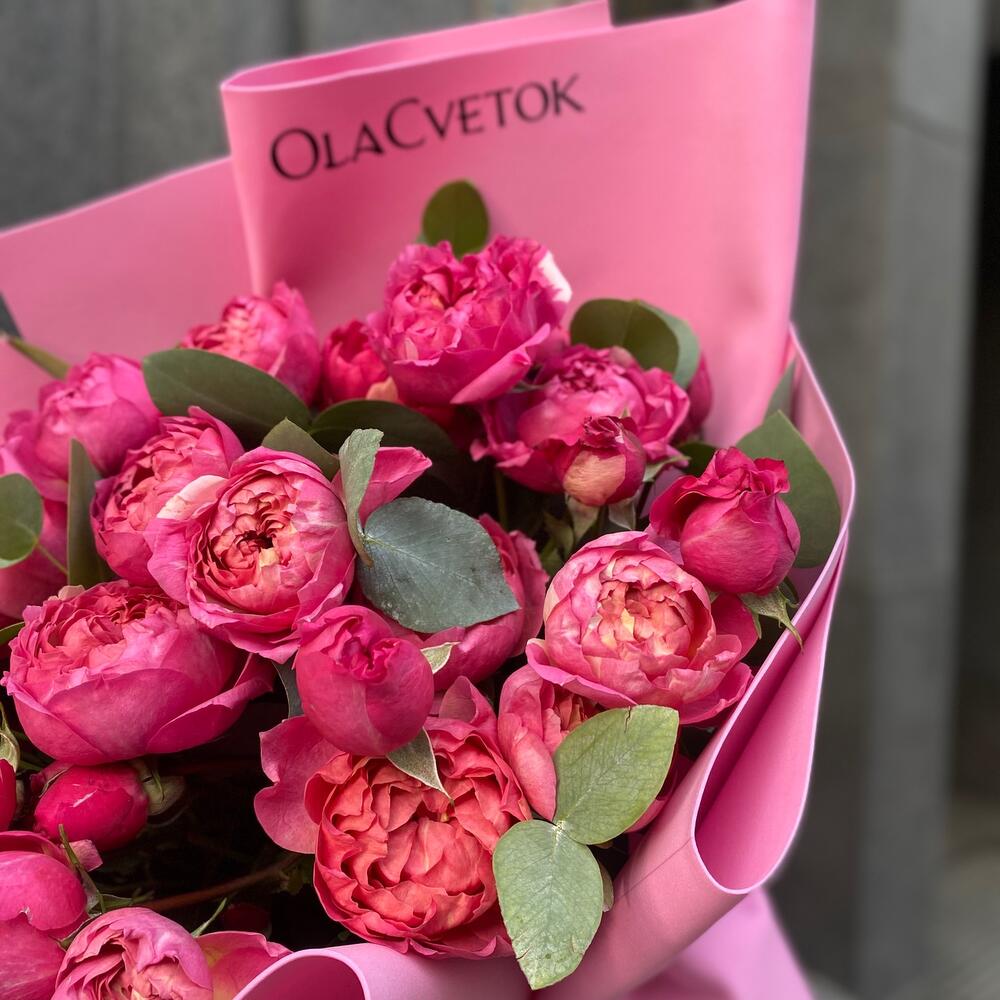Роза кустовая – 11 шт.Эвкалипт – 5 шт.Лента атласная – 2 шт.Фоамиран (упаковка) – 4 шт.Кризал (подкормка) – 1 шт.инструкция по уходу за цветами – 1 шт.