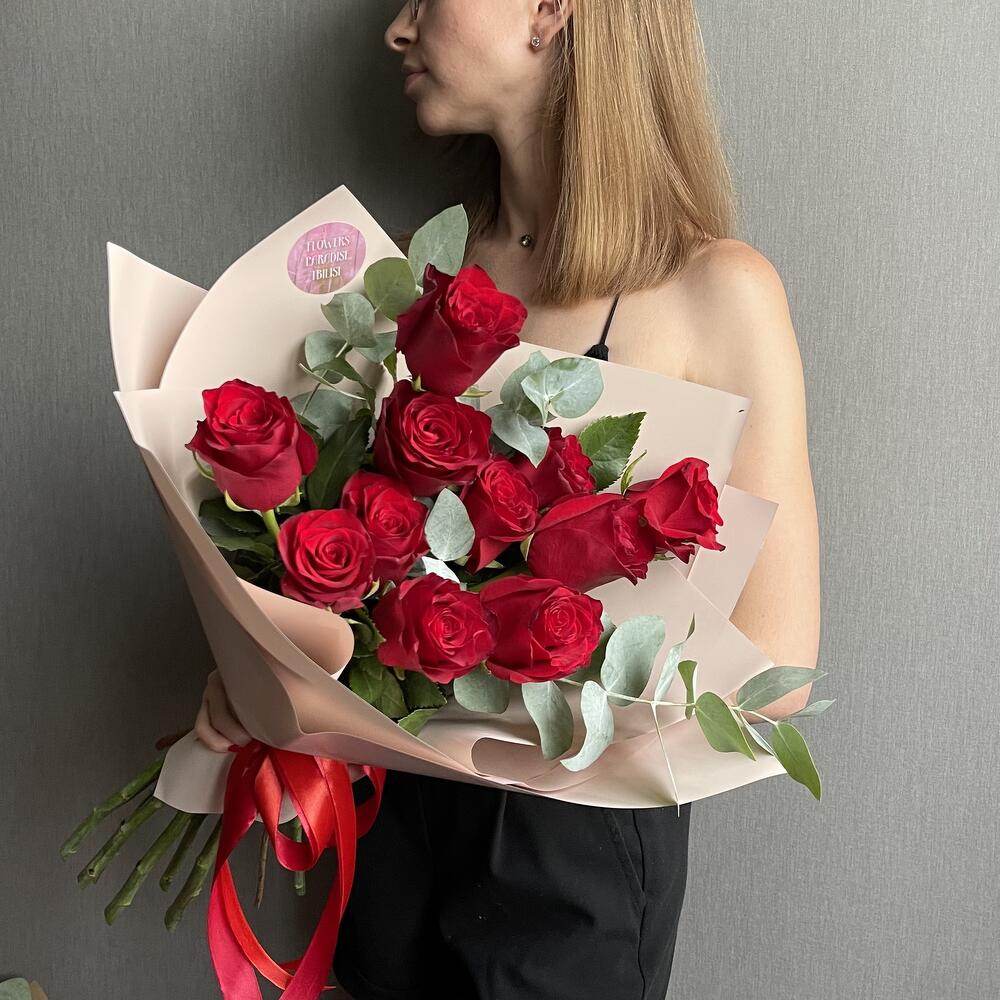 Роза – 11 шт. Эвкалипт – 3 шт. Упаковка – 1 шт. Атласная лента – 1 шт.