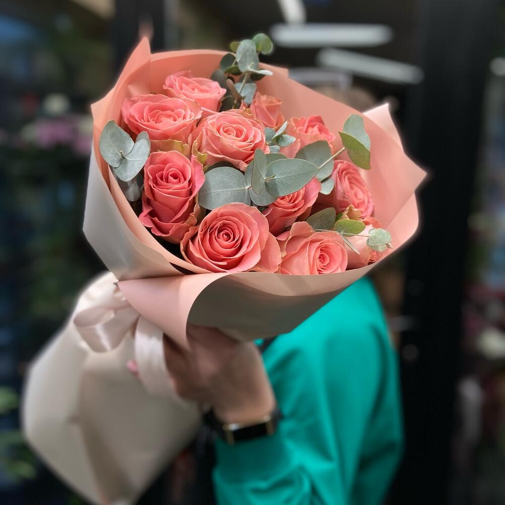Роза – 11 шт. Эвкалипт – 5 шт. Упаковка дизайнерская – 1 шт.
