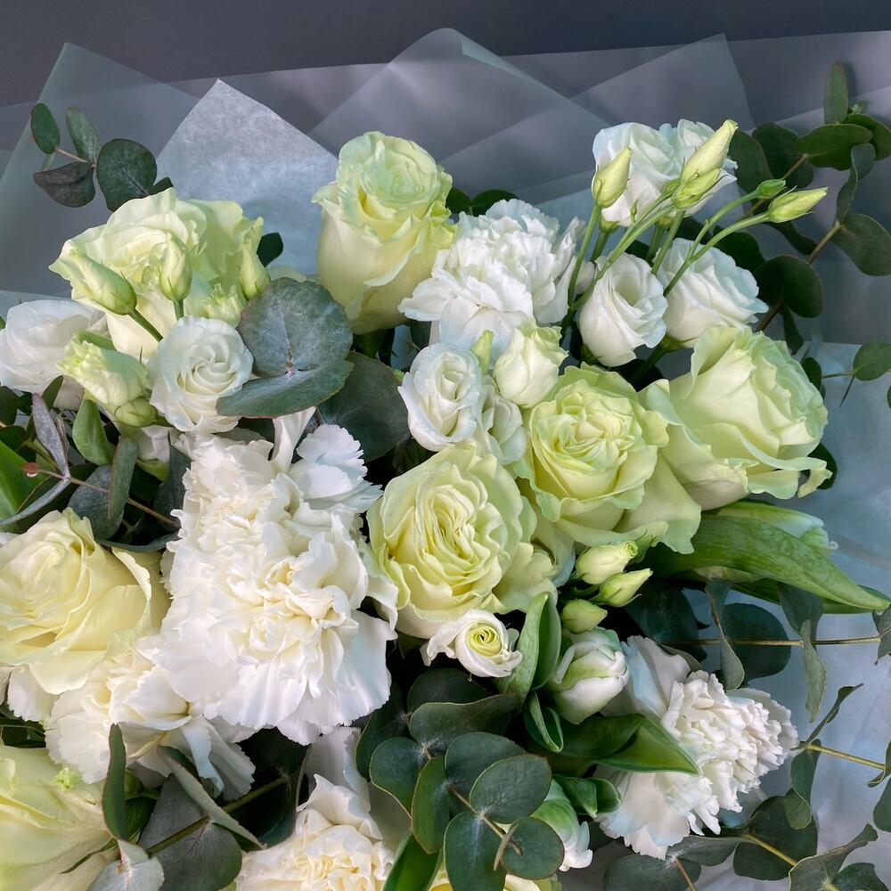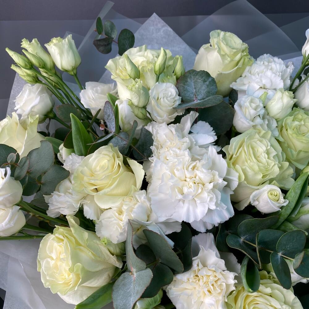 Лизиантус – 3 шт.Эвкалипт – 3 шт.Роза Эквадор – 9 шт.Диантус – 7 шт.Упаковка дизайнерская – 1 шт.Тюльпан белый – 9 шт.