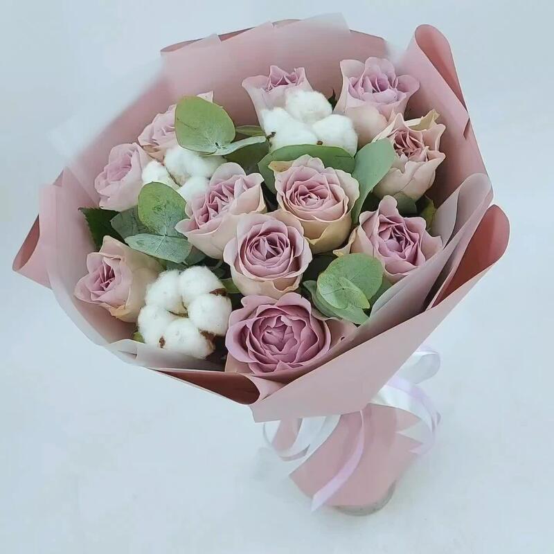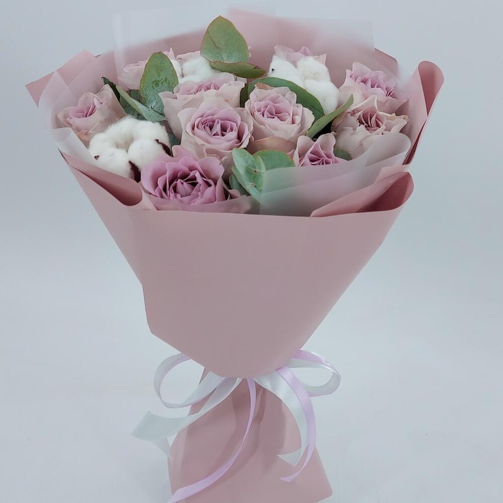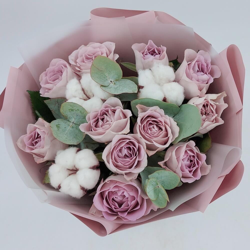 Эвкалипт – 4 шт.Роза сиреневая – 11 шт.Упаковка дизайнерская – 1 шт.Пистация – 2 шт.хлопок коробочки – 3 шт.
