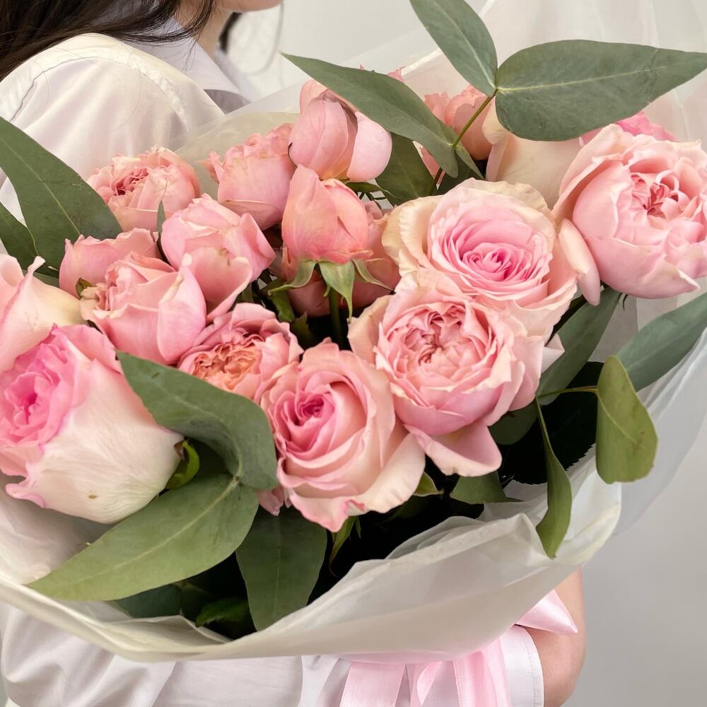 Эвкалипт – 2 шт.Роза – 5 шт.Тишью – 2 шт.Кустовая пионовидная роза – 4 шт.Упаковка дизайнерская – 1 шт.