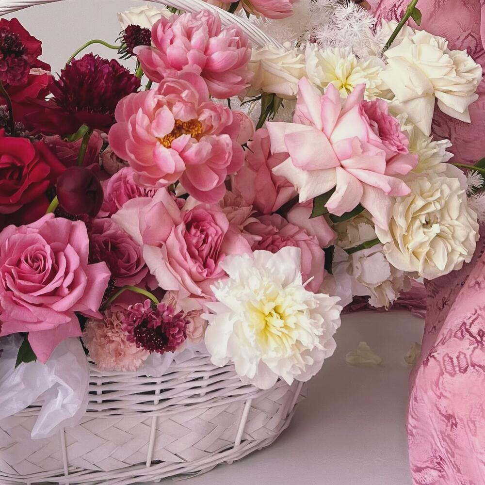 Пион – 5 шт.Сирень – 5 шт.Корзина плетеная – 1 шт.Французская роза – 19 шт.Фаленопсис – 1 шт.