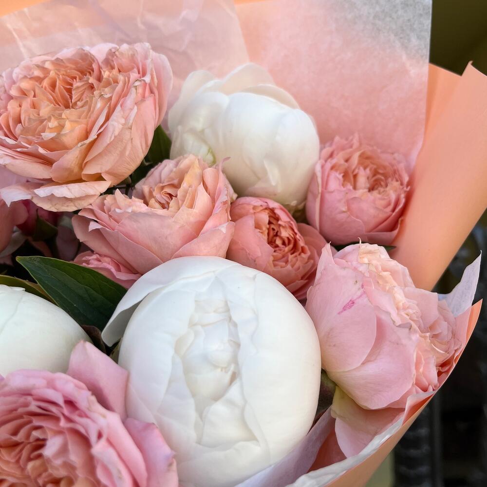 Пион белый – 3 шт.тишью белоснежное – 1 шт.упаковка корейская пленка персиковая – 1 шт.премиум пионовидных роза джульетта – 4 шт.