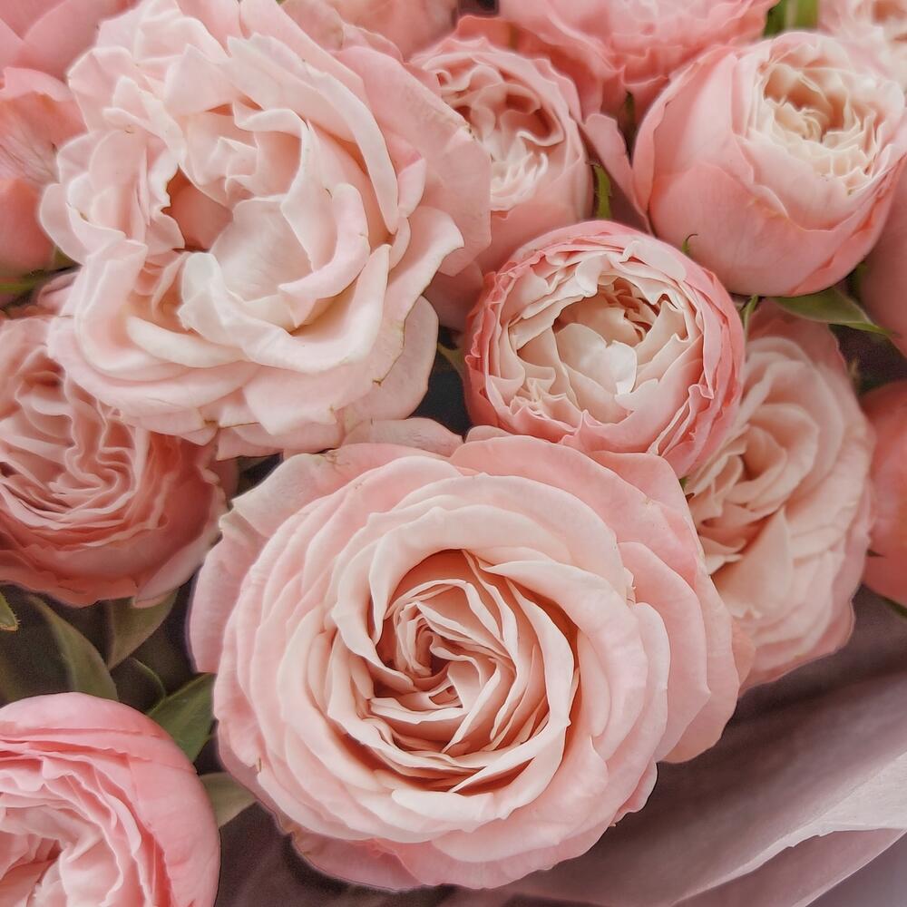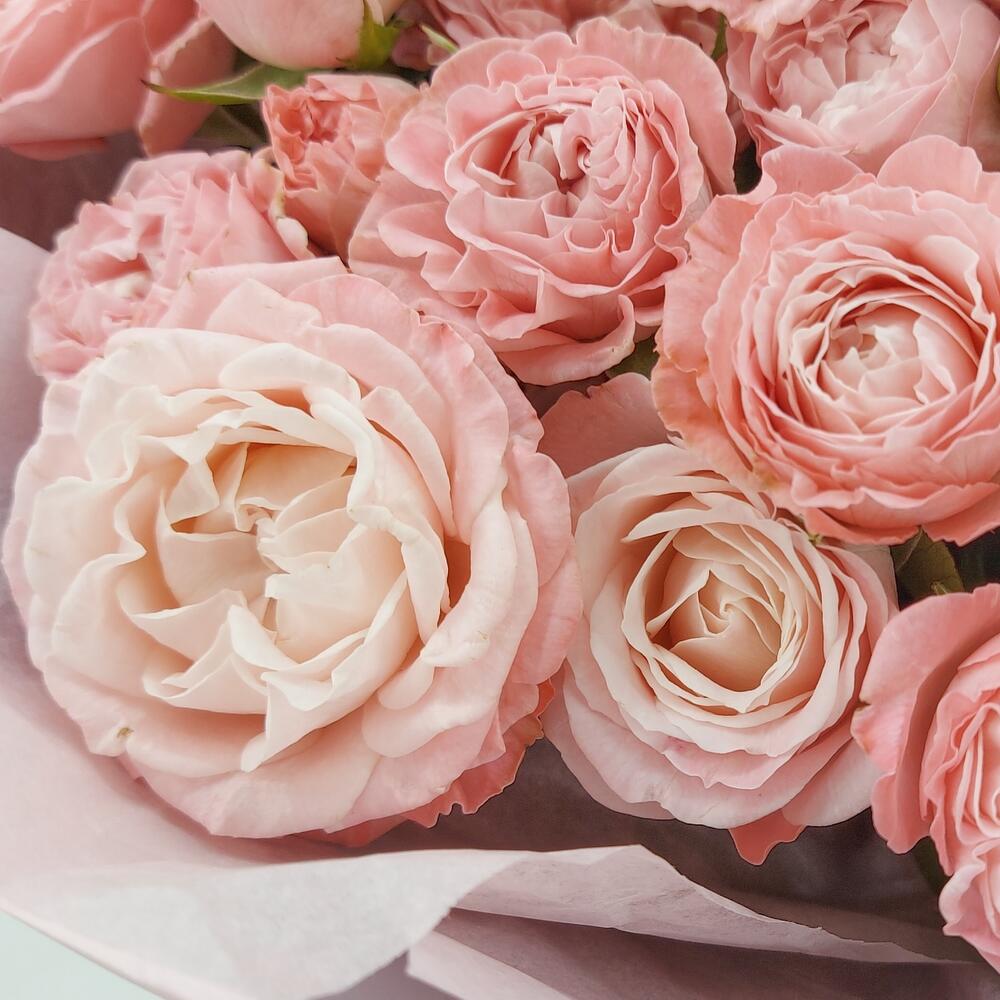 Нежные, пышные пионовидные кустовые розы Бомбастик в стильном, лаконичном монобукете – универсальный выбор по любому поводу или вовсе без повода. Можно преподнести маме, сестре, подруге, коллеге, любимой.