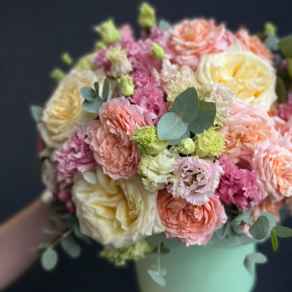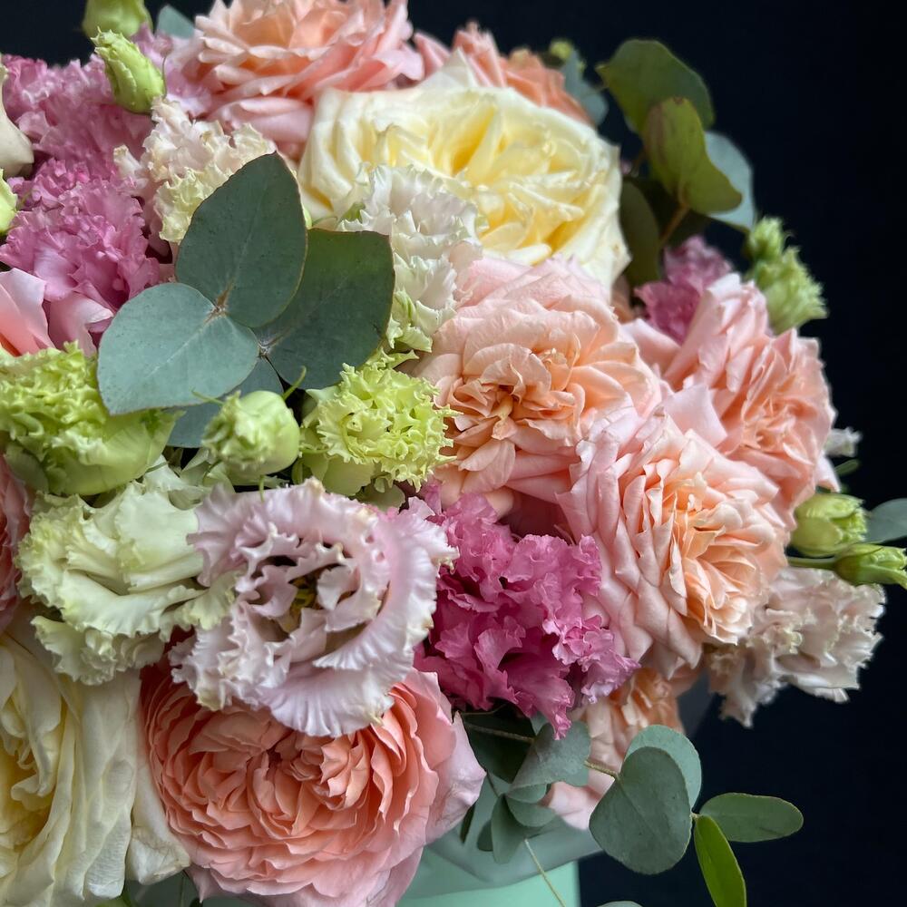 Лизиантус – 11 шт.Роза – 5 шт.джульетта роза пионовидная – 5 шт.Эвкалипт – 5 шт.Шляпная коробка с лентами – 1 шт.Флористическая губка – 1 шт.