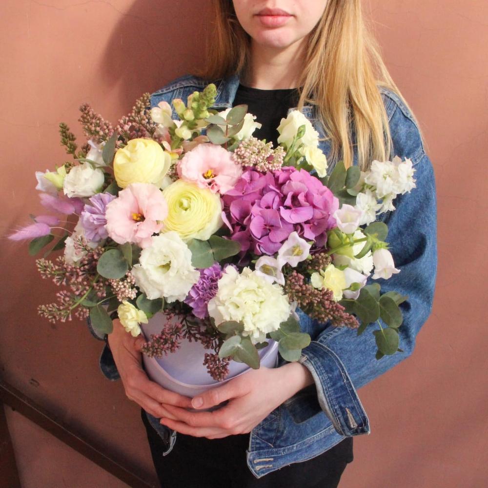 Ранункулюс – 2 шт.Роза пионовидная – 2 шт.Сирень – 2 шт.Лизиантус – 5 шт.Колокольчик – 2 шт.Антуриум – 2 шт.Гвоздика – 7 шт.Лагурус – 7 шт.Эвкалипт – 7 шт.Маттиола – 1 шт.Шляпная коробка – 1 шт.Оазис флористический – 1 шт.
