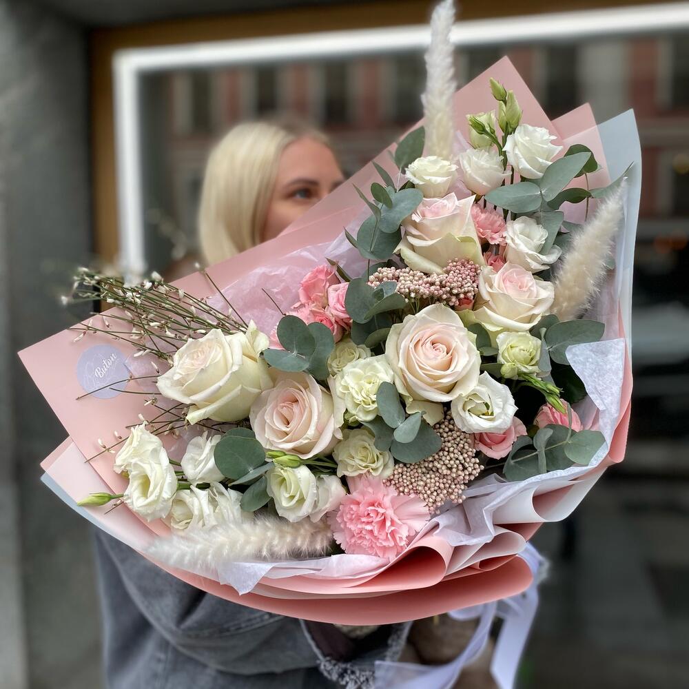 Роза одноголовая белая – 5 шт.Озотамнус розовый – 2 шт.эустома белая – 2 шт.Кустовая роза розовая – 3 шт.диантус анастасия – 3 шт.Эвкалипт – 1 шт.сухоцвет камыш – 2 шт.Дизайнерская упаковка – 1 шт.