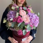 Гортензия – 2 шт.Маттиола – 3 шт.Статица – 2 шт.Эвкалипт – 5 шт.Коробка шляпная – 1 шт.Ранункулюс – 3 шт.Роза кустовая пионовидная – 3 шт.Оазис флористический – 2 шт.фотиния – 2 шт.