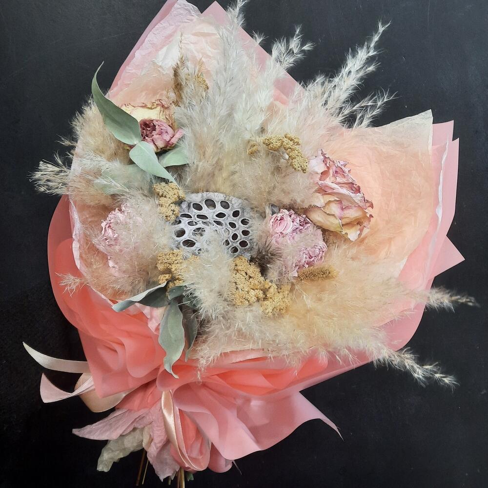 Эвкалипт – 2 шт.Лента атласная – 4 шт.Тишью – 2 шт.Калька – 2 шт.Роза сухоцвет – 3 шт.Тысячелистник – 9 шт.Лотос сухой – 1 шт.кортадерия – 1 шт.пион сухоцвет – 2 шт.