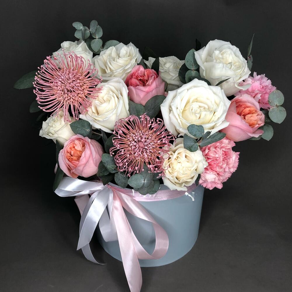 Роза пионовидная – 11 шт.Эвкалипт – 4 шт.Диантус – 3 шт.леукоспермум розовый – 2 шт.Оазис флористический – 2 шт.Коробка – 1 шт.Лента атласная – 3 шт.