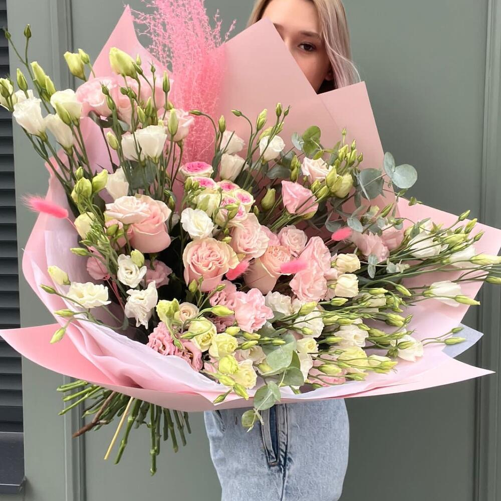 Гвоздики, Лизиантусы, Розы, Тюльпаны