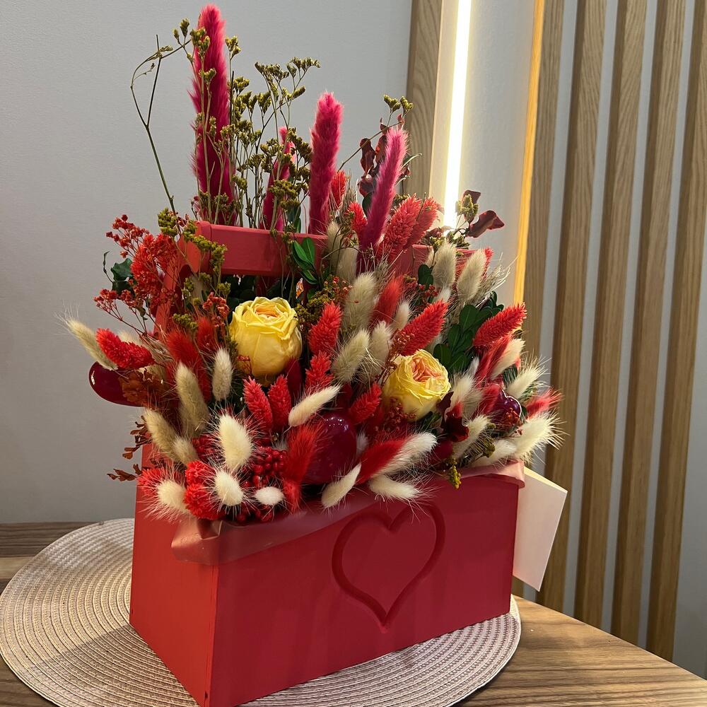 Яркая сочная композиция в ящикеВыполнена из сухоцветов , стабилизированных цветов.В составе есть 3 вставки в виде сердца Отличный подарок с любовью ❤️Необычный , не банальный , яркий сочный и не увядающий букет !)1-1,5 года будет радовать вас своими красками !)Композиция в красивый прозрачный упаковке , к каждой композиции в дополнение открытка , где можно написать пожелание , открытку можно выбрать при покупке написав в чат Сухоцветы и стабилизированные цветы – лучшая инвестиция в букет ,который не завянет!)