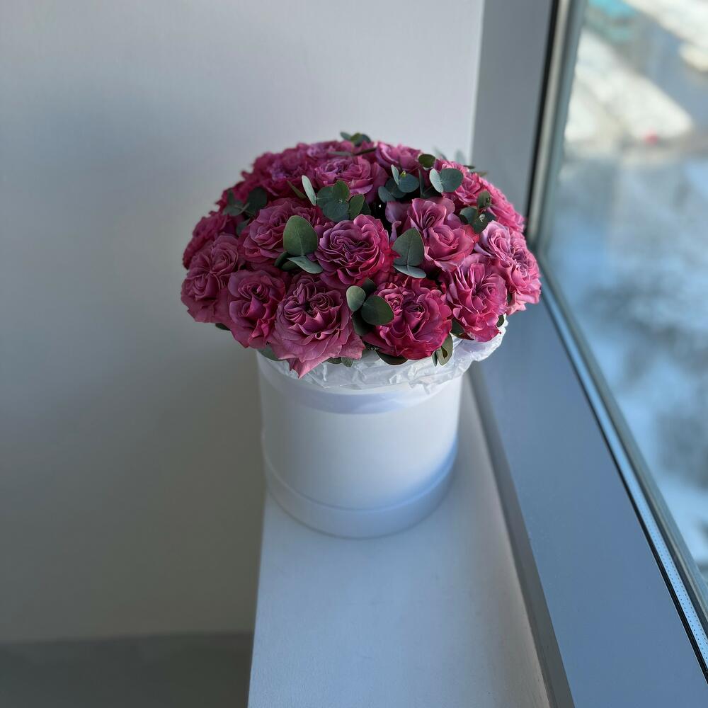 Шляпная коробка с фиолетовой пионовидной розой и эвкалиптом, 25 см в диаметре и 35 см высотой