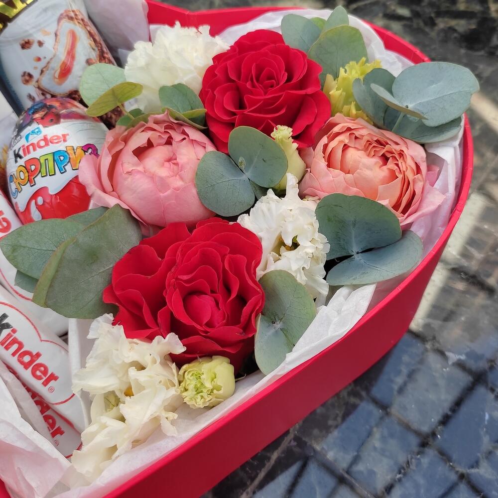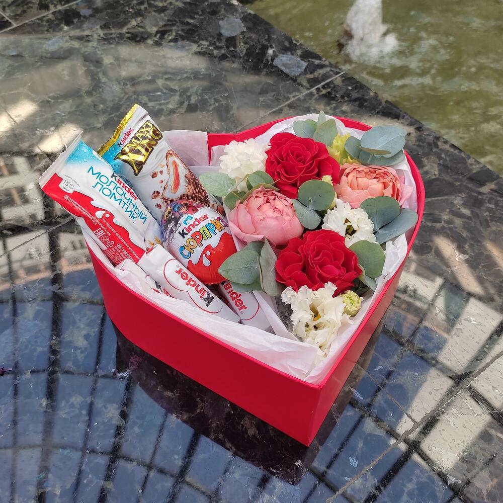 "Сладкое сердце " - цветочная композиция с сладостями в коробке "Сердце"