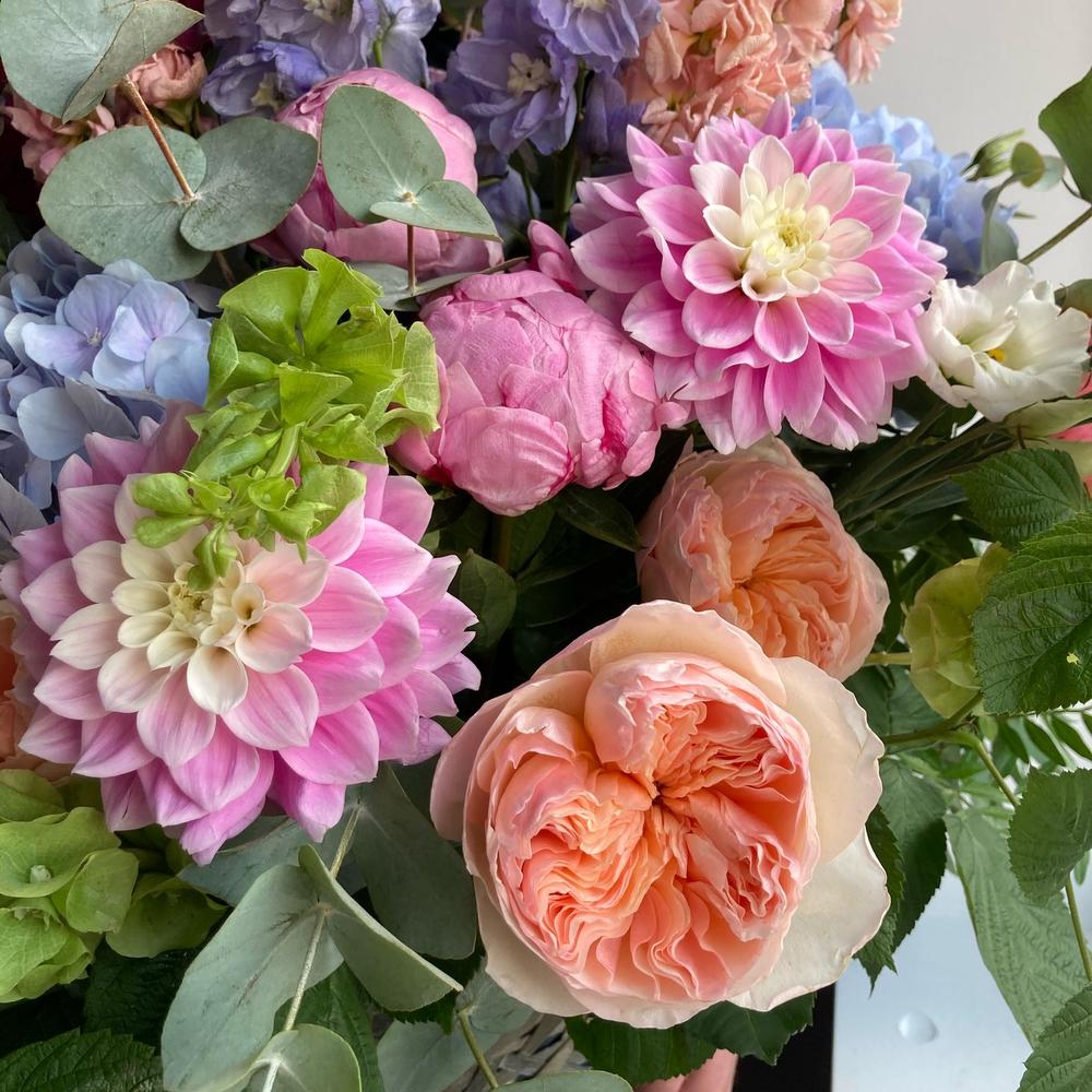 Тени в саду - Корзина с пионовидными розами, георгинами и дельфиниумом