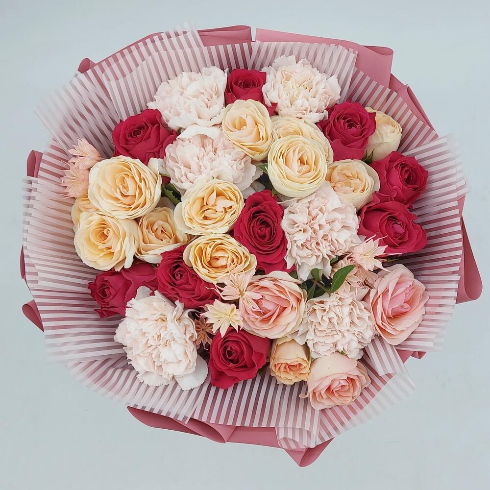 Стильный, фактурный букет из роз и диантусов. Такой букет всегда уместен и подойдёт для любого повода: День Рождения, именины, годовщина свадьбы, рождение ребенка, 8 марта, День Святого Валентина, выпускной и т.д. Можно вручить маме, сестре, подруге, коллеге, учителю, любимой.