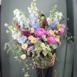 Дельфиниум – 5 шт.Львиный зев – 11 шт.Маттиола – 5 шт.Сирень – 6 шт.Пион – 7 шт.Роза пионовидная – 9 шт.Кампанула Лавандовая – 5 шт.Эвкалипт – 15 шт.Фисташка – 7 шт.Корзина – 1 шт.Оазис – 2 шт.