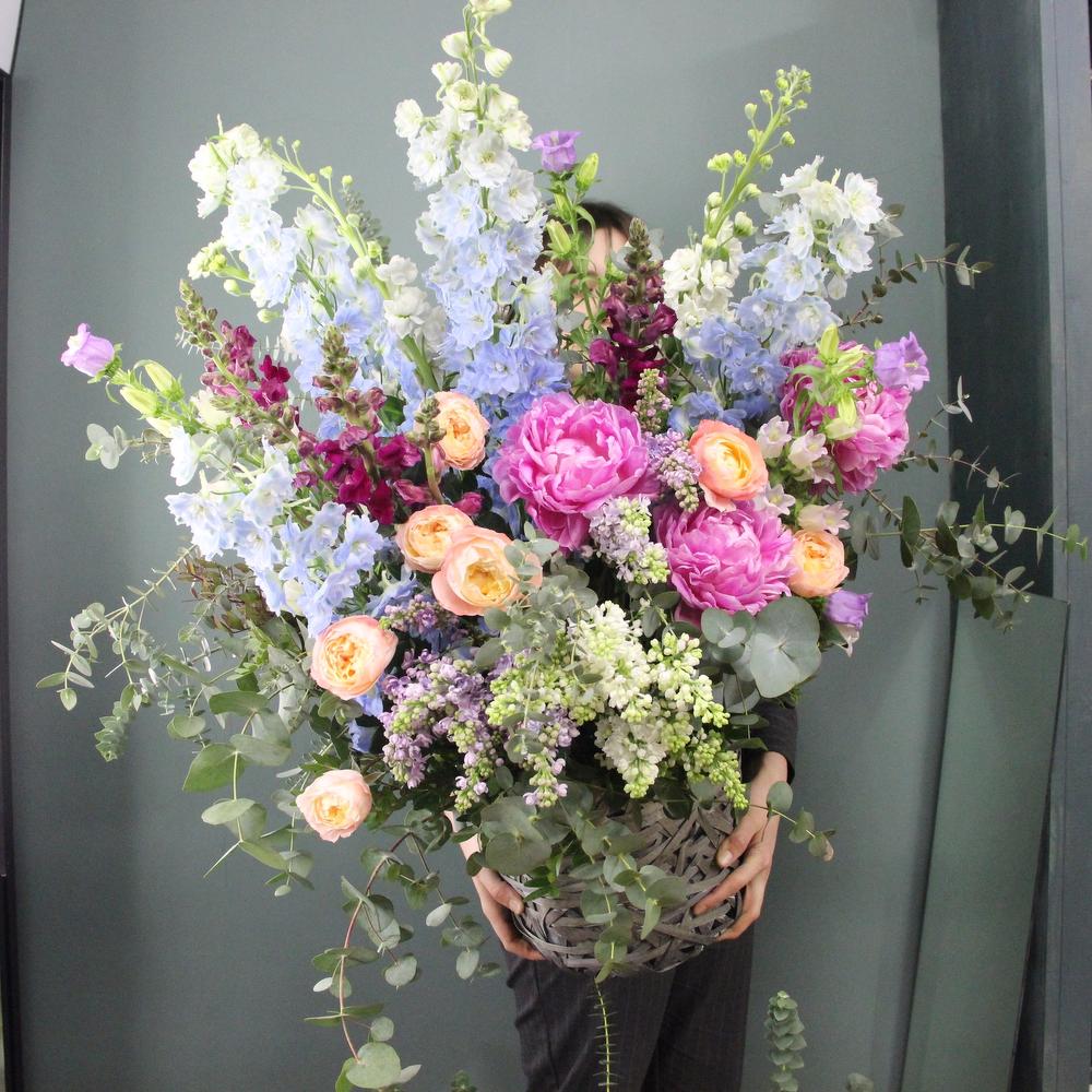 Садовая корзина с дельфиниумами, пионами, пионовидными розами, львиным зевом, сиренью и эвкалиптом.